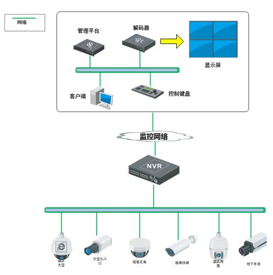 酒店宾馆整个监控系统,前端监控部分由网络摄像机(IPC)直接采集监控信号,然后网络硬盘录相机(NVR)通过局域网直连IPC取、存监控数据,并直接监管前端IPC各个通道。根据酒店宾馆的网络和实际应用情况,对视频监控存储系统的建设要满足如下需求: