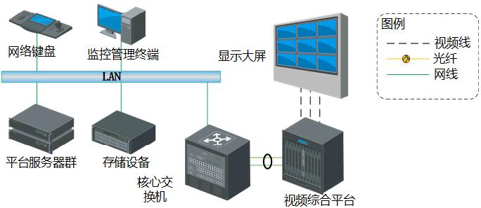 监控中心是整个视频监控系统的核心,实现视频图像资源的汇聚,并对视频图像资源进行统一管理和调度。其中,存储设备实现视频图像资源的存储及调用;视频综合平台完成视频解码上墙和图像的拼接控制;服务器支撑综合管理平台,并通过网络键盘进行视频切换和控制,通过高清大屏对高清视频进行精彩展现。
