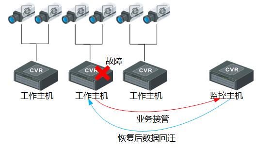 当系统运行时间较长时,难免不出现设备级故障。为了保证系统的高可靠高安全,强化系统的容灾性能,支持CVR的N+1冗余备机功能和录像备份功能。系统7*24小时不间断录像,硬盘总数较多,在运行中可杜绝整机替换、有效降低硬盘坏盘率。N+1备机冗余功能保证工作机故障时,录像业务不中断,数据不丢失,提供设备级保护,提升系统可靠性。其工作原理如下:
