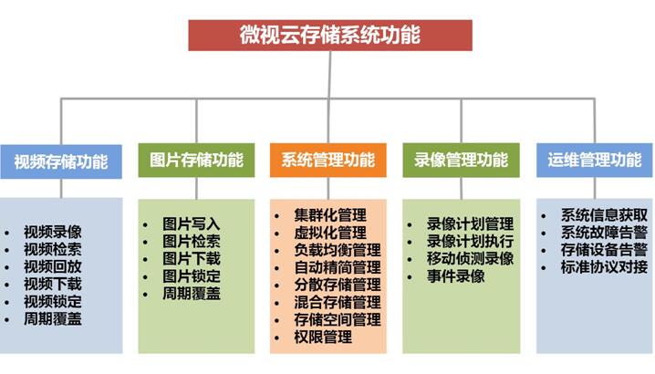 微视云存储系统面向视频、图片应用定制化开发,提供丰富的功能接口供上层综合管控平台调用,主要功能如下图所示: