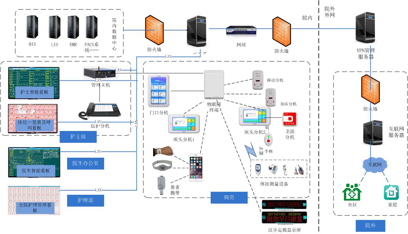 物联网智慧病房护理系统不仅以全新的方式提供强大完善的医、护、患通讯功能,而且创造性地提供了语音提醒、信息发布、信息采集、床头分机扫码缴费、与病房各检测设备提供简易多方式连接数据自动上传、信息处理等新功能,实现了医院信息管理(HIS)系统向病房的延伸,是医院数字化建设中不可缺少的重要组成部分。在大大减轻医护人员工作强度的同时,真正实现了医护质量质的飞跃。