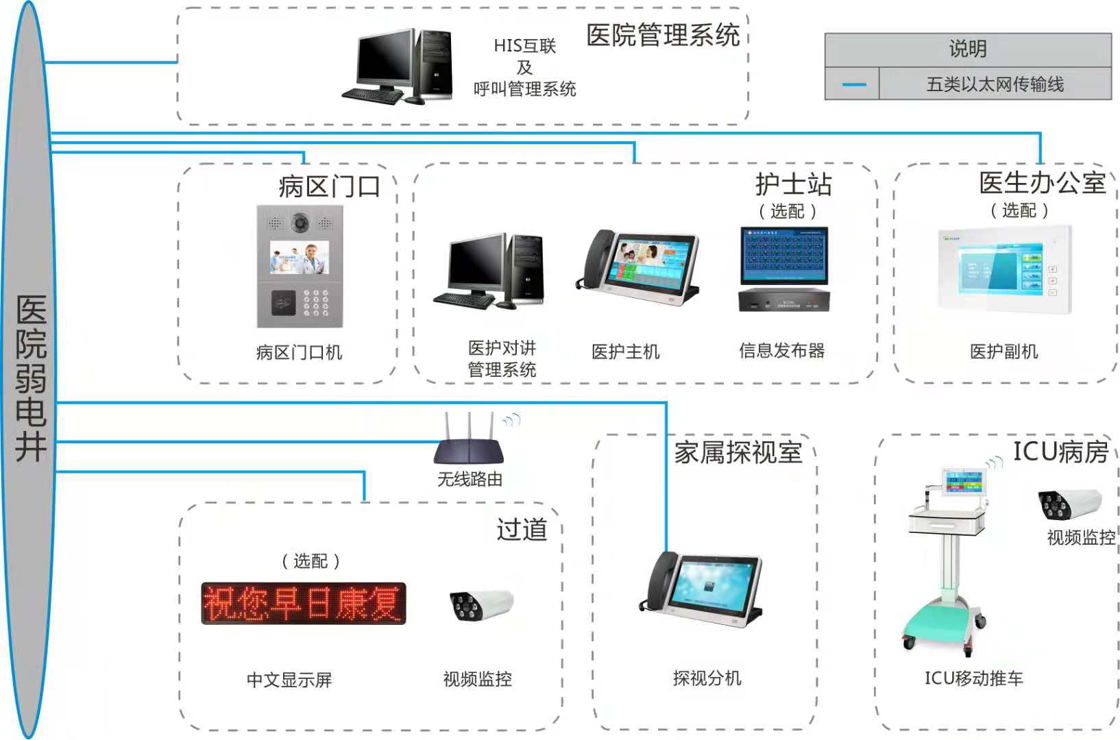 探视分机与病床分机对讲:探视分机、病床分机都自带摄像头。探视分机先呼叫ICU医护主机,由医护人员通过ICU医护主机呼叫要探视的病床分机,确认允许探视的条件后,再转接要对应的ICU病床分机,此时家属与重症患者进行双向可视对讲。