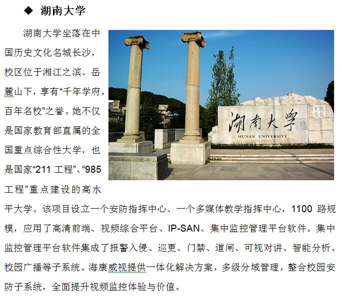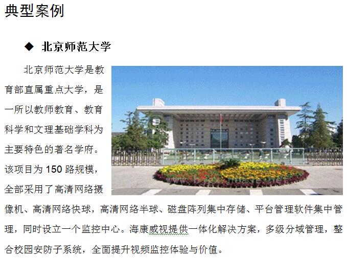 现各地市的大中学校都普遍存在着校园面积大、场地分散,学生众多,校园周边的环境复杂等特点,随着近年来校园暴力事件和突发事故的增加,传统的人力巡查已不能满足校园安全管理的需求,越来越多的学校开始考虑通过校园网络视频监控系统的实施来建设平安校园。