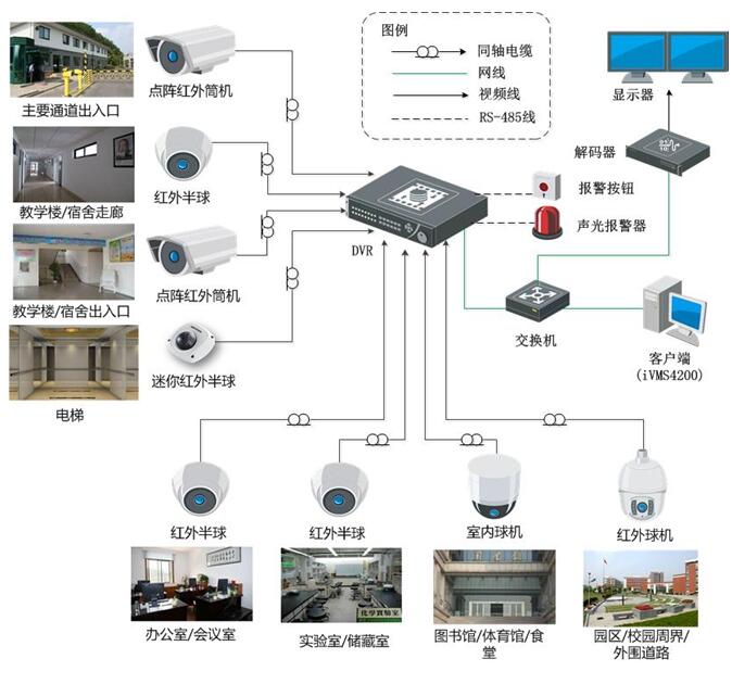 | 本方案在各监控点位部署功能对应的摄像机完成视频采集,通过DVR完成视频存储,通过解码设备做本地显示,所有的监控设备通过客户端实现联网管理,操作简单,施工方便,并且可以扩展。 |
