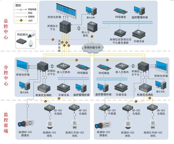 2) 数字高清非压缩监控前端经光纤传输统一接入对应分控中心的视频综合平台,由视频综合平台完成视频切换、控制、上墙、视频编码等一系列高清视频应用功能。选用的视频综合平台应具备强大的交换能力,保证切换、控制的实时性,输出的图像为非压缩原始图像,保证了大屏显示的图像质量、清晰度和流畅性;