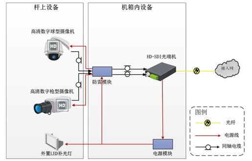 前端接入可根据实际情况,选择同轴电缆接入、同轴电缆+HD-SDI中继器接入、光纤+HD-SDI光端机接入等几种方式。